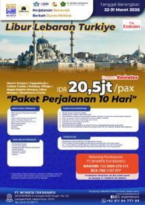 * Harga paket, program perjalanan, akomodasi (maskapai, hotel, bus) sewaktu-waktu dapat berubah tanpa mengurangi pelayanan dan disesuaikan dengan kondisi terakhir di lapangan.